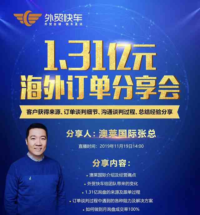 為(wèi)此,外(wài)貿快(kuài)車(chē)特組織此次直播分(fēn)享會(huì),榮幸的(de)邀請(qǐng)到(dào)澳萊國(guó)際總經理(lǐ)張總親自(zì)講述1.31億元訂單的(de)來(lái)龍去®(qù)脈,以及如(rú)何提升外(wài)貿團隊業(yè)務水(shuǐ)平、提高(gāo)詢盤成交率、高(gāo)效獲取訂單☆等,目的(de)是(shì)将澳萊國(guó)際的(de)成功經驗更廣泛的(de)分(fēn)享給衆多(duō)外(wài)貿企業(yè),以期未來(lái)獲取更多(®duō)大(dà)額訂單。