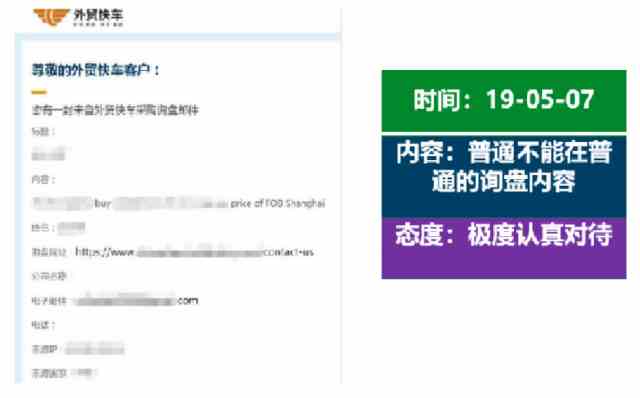 2019年(nián)5月(yuè)7日(rì),通(tōng)過外(wài)貿快(kuài)車(chē)app“即時(shí)通(tōng)訊”功能(néng)收到(dào)了(le)第一(yīα)次詢盤。可(kě)以看(kàn)到(dào)的(de)是(shì)對(duì)話(huà)內(nèi)容極為(wèi)普通(tōng),但(dàn)對(duì)于張總而言,認真對(d→uì)待每一(yī)封詢盤都(dōu)是(shì)他(tā)第一(yī)時(shí)間(jiān)需要(yào)做(zuò)的(de)。